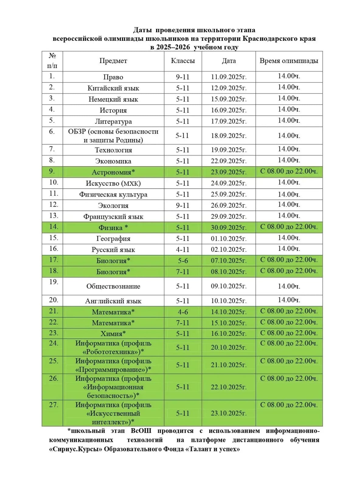 1) Порядок проведения всероссийской олимпиады школьников
